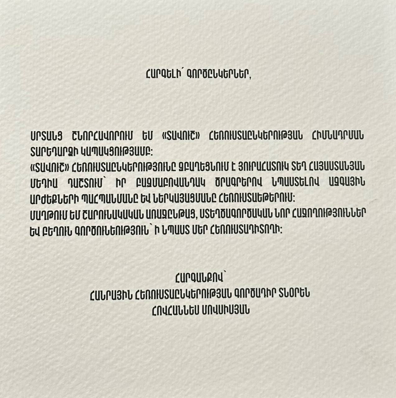 Մաղթում ենք` սեյսմակայուն ու սողանքակայուն, ջրակայուն ու հրակայուն հույս ու հավատ, գնահատանք-պարգևատրում- նվերների անձրեւ, հաջողությունների ու նվաճումների հեղեղ, հաճելի անակնկալների սելավ, դիմակայող պատվար-պատնեշների, թշնամության ամրոցների փլուզում, համաճարակի միտող համատարած վարակ` բարության ու գթասրտության: